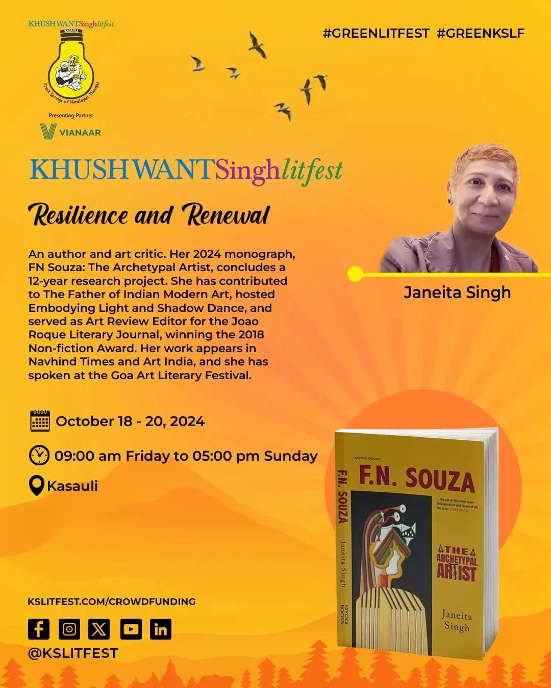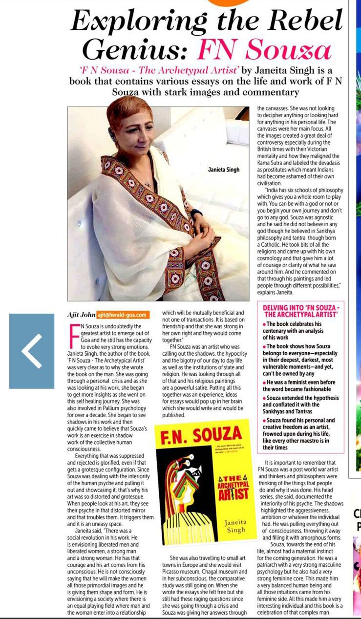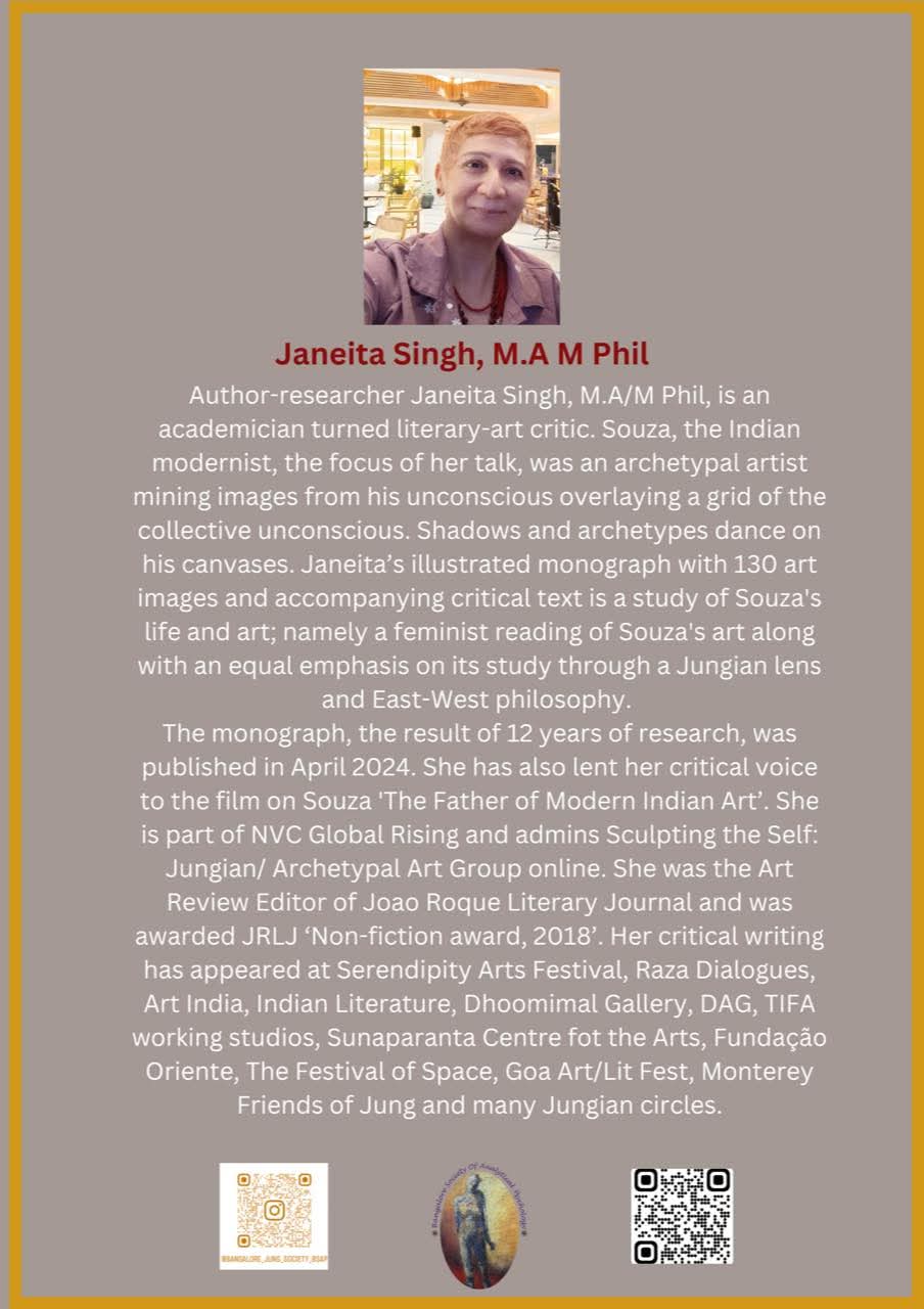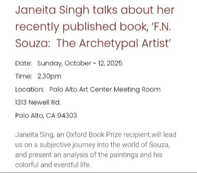 Podcast on FN Souza: The Archetypal Artist with Robert Carriger and Claire Kohne at Carl Jung Institute San Francisco, April 2026 Janeita Singh talks about her book at the Palo Alto Art Center, San Francisco, in collaboration with SACHI 12 October 2025 The Psycho-Spiritual Underpinnings of FN Souza: The Archetypal Artist" —with Janeita Singh hosted by Friends of Carl Jung, 381 High Street (Mc Gowan House) Monterey, CA My catalogue essay titled, “Love Longing and Letting Go” at Waswo X Waswo’s exhibition, “The Darkness and the Star” Bikaner House Delhi 04 December 2025 Sexuality, Feminism & Rebellion: Discussion on Souza’s art with Dr Meera Dass Bhopal Literature Festival January 2026 Coloring Outside the Lines: Discussion on FN Souza: The Archetypal Artist Bangalore Literature Festival 6-7 December 2025 FN Souza: The Archetypal Artist at New York University & the New York Public Library 30 September 2025 Registered researcher at the Library of Congress, The Frick Art Research library and The Metropolitan Museum of Art Met my book at The Met, Thomas J Watson library, The Metropolitan Museum of Art 01 October 2025 Smithsonian National Museum of Asian Art, an interaction at the library 08 September 2025 The Library of Congress, Washington DC,an interlude with my book at the Asian Division Jefferson Building Washington DC 12 September 2025 Soft book launch by Aroon Shivdasani, Ex Director Indo-American Arts Council 517East 87th Street Manhattan York Ave NY 03 September 2025 FN Souza: The Archetypal Artist at Sotheby's 945 Madison Ave, New York 04 September 2025 At the Butler Library, Columbia University, an interlude with my book 03 September 2025, 116th and Broadway, New York Museum of Modern Art, conversation over lunch at the MoMA Cafe 02 September 2025 FN Souza: The Archetypal Artist at Marquand Library Princeton University 29 August 2025 The nation’s (the US) first university is home to my book. Housed at the UPenn libraries, The Fisher Fine Arts Library, University of Pennsylvania 28 August 2025 Souza’s Modernism: Decolonising Art History, conversation with Annapurna Garimella at Bangalore International Centre Jun 2025 FN Souza: The Archetypal Artist, panel discussion with Dr Alka Pande & Needhish Tyagi at IIC, India International Centre May 2025 Goa Art & Literatue Festival, Book launh and discussion with Reema Gehi Desai February 2024 The Provocative Palette: A discussion with Asad Lalljee & kamini Sawhney at Literature Live Mumbai 15 November 2024 FN Souza's Still Life 1960, ICONIC - 04 Delhi Art Gallery, Art Mumbai 14-17 Nov 2024 Museum & an Artist: Conversation with Tasneem Zakaria & Veerangana Solanki at Khushwant Singh Literature Festival 18-20 October 2024 A seminar on Yoking with Jung: FN Souza & Carl Jung Bangalore Society of Analytical Psychology September 2024 FN Souza; The Archetypal Artist at Frankfurt Book Fair 16-20 Oct 2024 Xavier Centre of Historical Research, book launch and discussion with Delio Mendonca, 01 August 2024 Museum of Goa book event, in conversation with Lina Vincent 07 July 2024 Souza’s radical art: A presentation – Friends of Carl Jung Monterey Library San Francisco17 July 2024 Book launch at Dogears Bookstore Goa, In conversation with Rinald D’ Souza 11 May 2024 The Archetypal Artist makes its presence felt at the World Book Fair for the third consecutive year, Bharat Mandapam, Pragati Maidan, Delhi. 10-18 Feb 2024, 1-9 Feb 2025, 10-18 Jan 2026 FN Souza: The Archetypal Artist, book launch at the exhibition Reminiscing Souza: An Iconoclastic Vision (Dhoomimal Gallery) at Lalit Kala Academy, New Delhi, 07 Feb 2024 Book exhibit at the exhibition Reminiscing Souza: An iconoclastic vision LKA Souza’s first book & the latest book on Souza Words & Lines / FN Souza: The Archetypal Artist A significant display!1-15 Februrary 2024